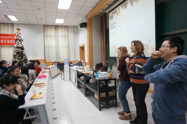 12月22日下午,一场气氛欢快的德语圣诞派对在北京语言大学培训学院外语部主北158教室隆重举行。德语外教Maria、Charlotte、中教佟文斌老师与德语秋季周末班的同学一起烘焙德式饼干、唱歌做游戏、煮制德国热酒等,师生共同庆祝圣诞节。期间佟文斌老师还为大家生动地讲解了德国圣诞习俗。学生们通过学烘焙、饮热酒、唱圣诞歌、做游戏,不仅度过一个欢乐的圣诞节,而且还充分的了解了德国文化。继此次圣诞派对之后,本周23日和25日晚,德语晚班的学生们也将享受到这样集视、听、味觉于一体的圣诞盛宴。